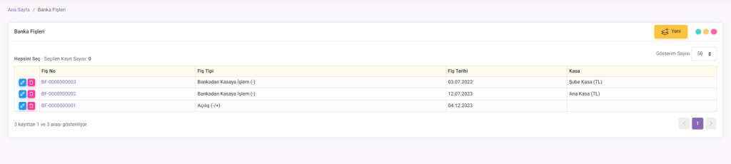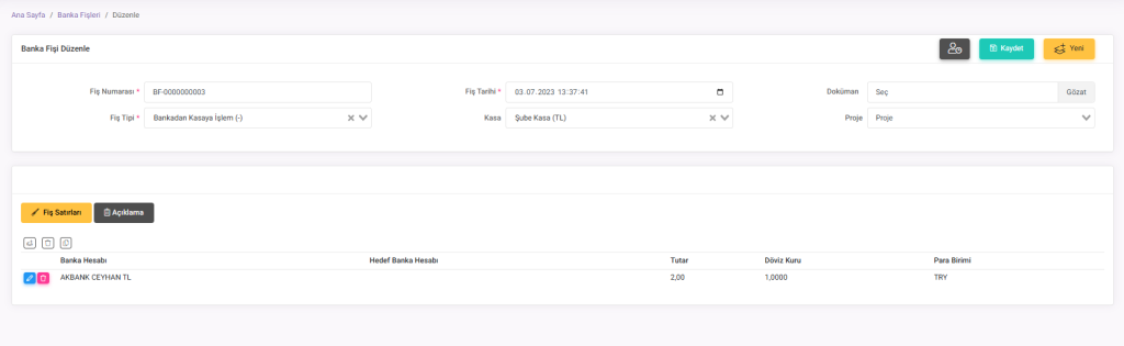 Banka Fişleri alanı, bankadan kasaya veya kasadan bankaya yapılan işlemlerin kayıt altına alındığı ve yönetildiği yerdir. Bu alanda, her bir banka fişinin numarası, tipi, tarihi ve ilgili kasa bilgileri listelenir. Kullanıcılar yeni banka fişleri ekleyebilir, mevcut fişleri düzenleyebilir veya silebilirler.
