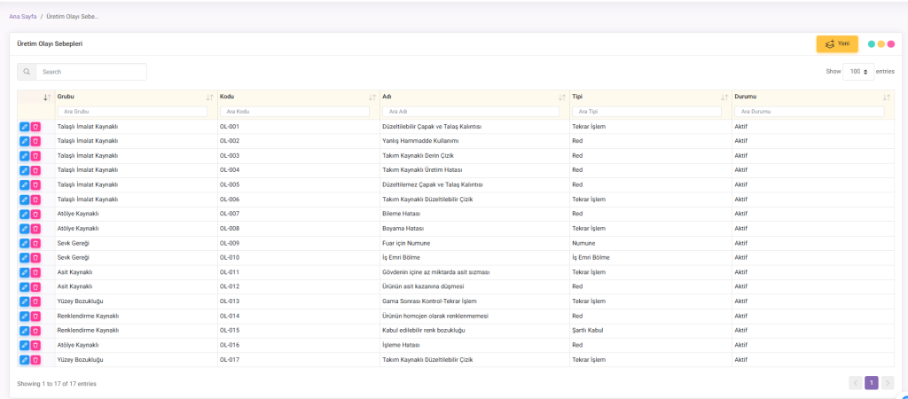 Üretim esnasında bir ürünün başına gelebilecek Red Tekrar İşlem ve Numune gerektiren durumları ifaden etmektedir. Bu kısımda üç tipte olay belirlenmektedir.
