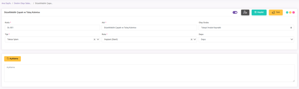 - Tekrar İşlem: Yeninden işleme alınarak kullanılabilecek ürünler için yapılan tanımdır. Bu tipte olan durumlar için Tekrar İşlem aşama dizileri tanımlanması gerekmekte ve duruma göre doğru aşama dizisi seçilmektedir. Üretim emirlerinde duruma bağlı olarak “Tekrar Üretim Emri” oluşmaktadır.