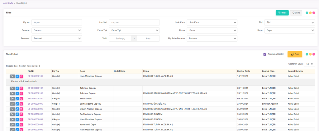 - Reddedildi: Kabul edilmeyen stok fişlerin durumunu gösteren alandır.
