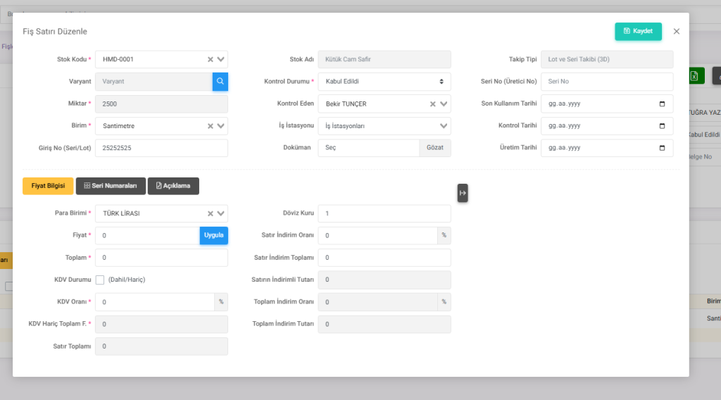 Kontrol Eden Personel: İlgili fişi kontrol eden personelin tanımlandığı alandır. Bu alana tanımlı personel fişteki bütün ürünlerden sorumlu durumundadır.