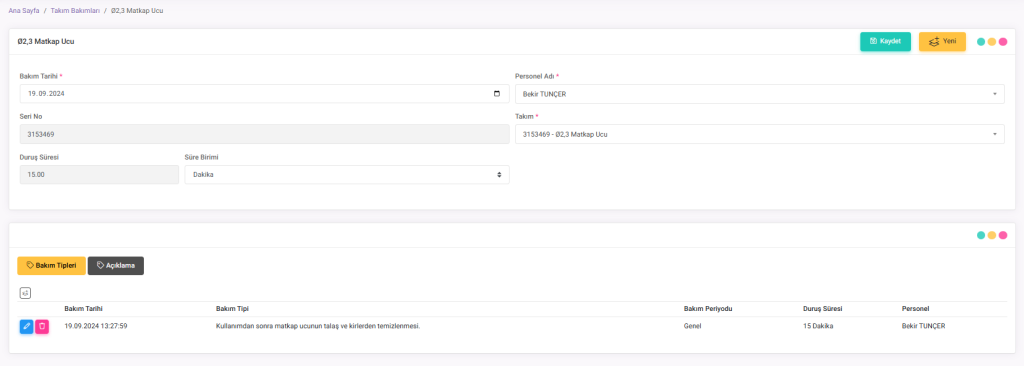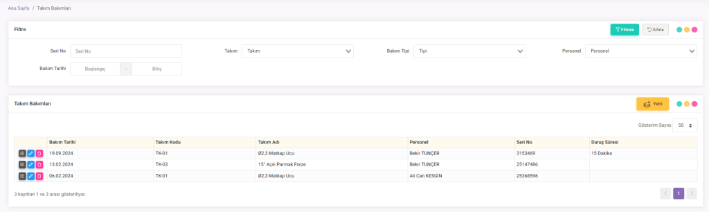 Takım Bakımları, Tezgahlarda kullanılan Takımların bakımını kayıt altına alındığı alandır. Takımların periyodik bakım zamanlarını belirlemenizi, bakım tiplerini atamanızı ve her bir bakımın ne kadar duruş süresi gerektirdiğini girerek yönetmenizi sağlar. Tüm bu süreçler, bakım işlemlerinin kayıtlarının tutulmasını sağlar.