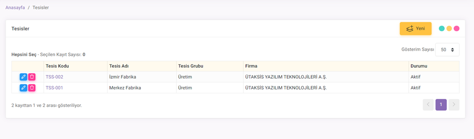 Tesisler bölümü, üretimin gerçekleştirildiği fiziksel yerleri temsil eder. Bu tesislerdeki üretim emirleri özel olarak atanabilir. Bu bölümdeki personel, sadece bu tesislerdeki üretim iş emirlerini görüntüleyebilir ve yetkilendirme yapabilir. Kısacası, üretim emirlerinin oluşturulduğu ve işleme alındığı tesisi ifade eder.